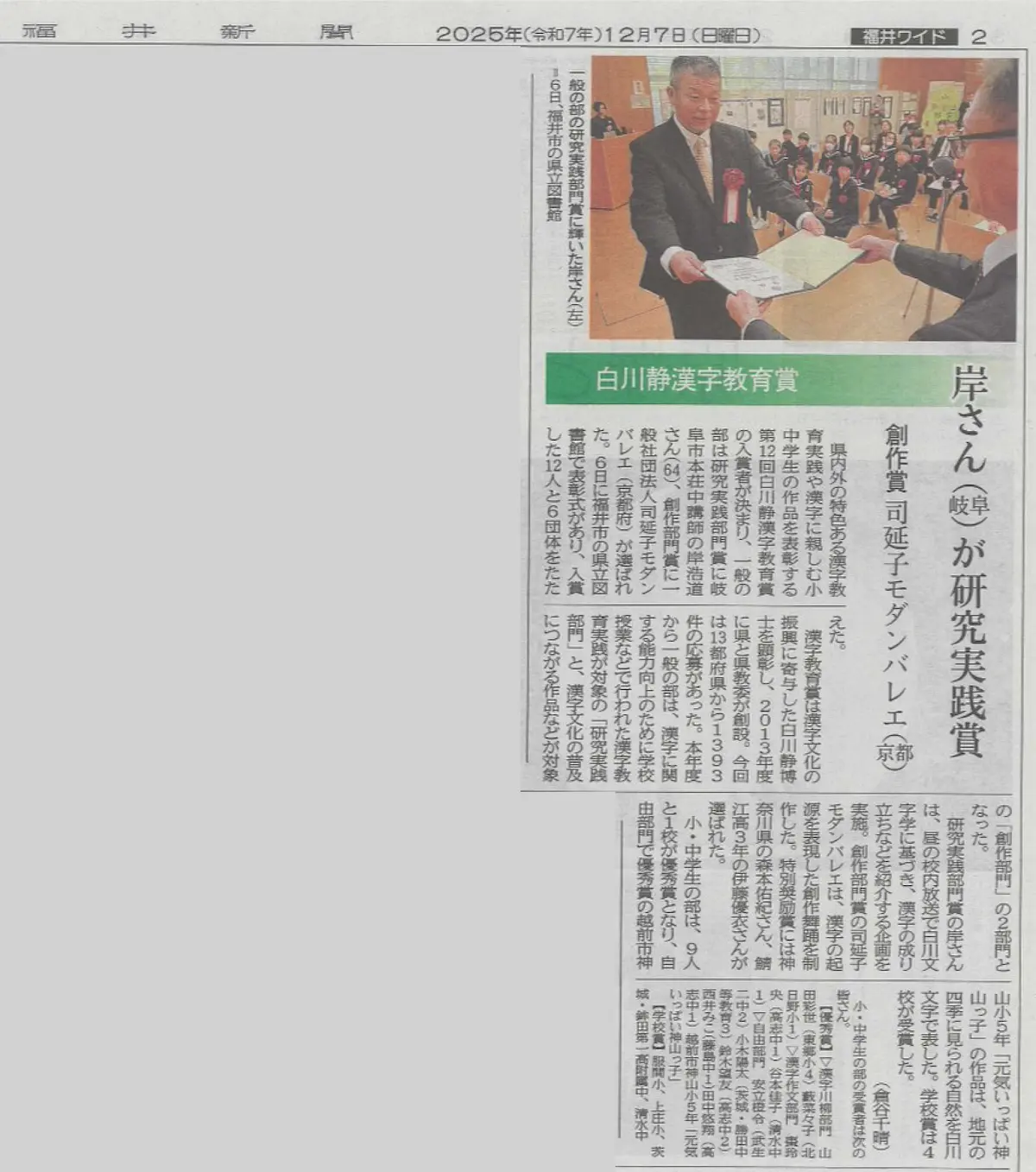 第12回白川静漢字教育賞の一般の部・創作部門賞に、一般社団法人 司延子モダンバレエが選ばれました。漢字の起源を表現した創作舞踊を制作し、その取り組みが新聞で紹介されました。